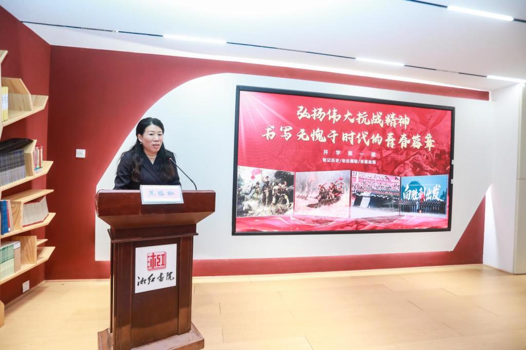 焦珞珈以《弘扬伟大抗战精神书写无愧于时代的青春篇章》为题,为在场师生带来一堂深刻生动的“开学第一课”。她从铭记历史,回溯艰苦历程;感悟力量,弘扬伟大精神;开学之思,汲取成长力量三个层面,通过详实的历史资料和感人至深的英雄事迹,深刻阐释了伟大抗战精神的丰富内涵和时代价值。焦珞珈勉励同学们要传承红色基因,赓续精神血脉,将个人理想融入国家发展伟业,在中国式现代化建设中挺膺担当。
