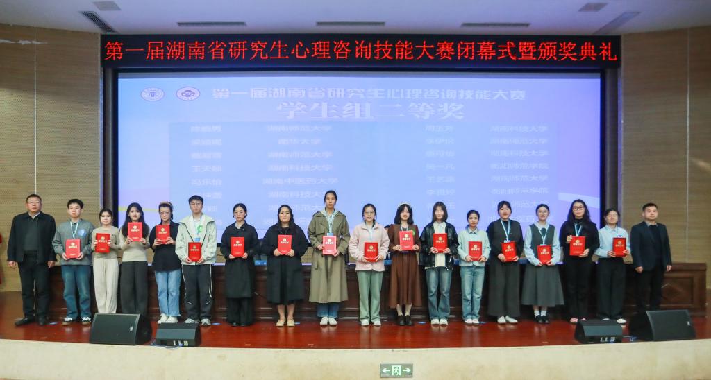 据悉,本次赛事历时4个月,分为初赛、复赛和决赛三个阶段,吸引了来自全省心理学、应用心理学等相关专业的众多研究生同台竞技。赛事覆盖全省所有心理学、应用心理学、心理健康教育、精神病与精神卫生学、护理学、社会工作研究生培养单位。经过激烈角逐,最终共评出教师组一等奖6名、二等奖9名、三等奖5名;学生组一等奖11名、二等奖16名、三等奖9名。湖南师范大学和湖南科技大学荣获优秀组织奖。
