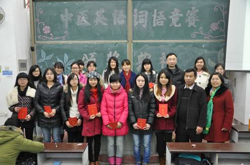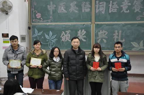 2014年12月30日晚7点,由湖南中医药大学教务处主办、人文社科学院承办的湖南中医药大学第一届中医英语词语竞赛颁奖典礼在含浦校区1105教室举行。教务处陈楚淘副处长、人文社科学院叶利军副院长、人文社科学院外语系毛英副主任、医学英语教研室肖平主任、医学英语教研室全体教师以及获奖同学、2014年中医专业5、6班同学参加颁奖典礼。