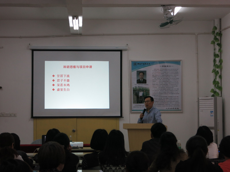 2014年5月8日下午,在我院大会议室,湘潭大学外国语学院胡强教授进行了主题为《科研思维与项目申请》的讲座,讲座由我院副院长叶利军主持,外语系的教师和英语专业部分本科生参加了本次讲座。