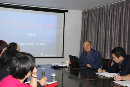 2013年11月6日,我院特邀《中国医学伦理学》杂志主编李恩昌教授在学院会议室开展了一场精彩的讲座,讲座的主题是“医学人文类论文写作中的问题——以医学伦理学论文为例”,学院领导、思政课全体老师与其它教研室的老师代表参加。讲座由学院院长毛新志教授主持。