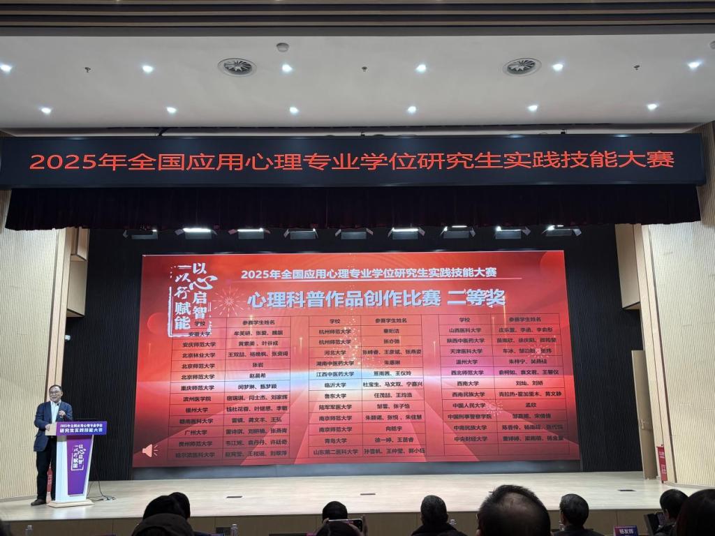 2025年12月6日至7日,由中国学位与研究生教育学会应用心理专业学位工作委员会与华东师范大学心理与认知科学学院联合主办的“2025年全国应用心理专业学位研究生实践技能大赛(决赛)”在上海隆重举行。经过初赛阶段180位专家严格选拔,来自全国85所院校的300余位师生齐聚现场。我院学子在激烈角逐中表现优异,斩获三项二等奖,充分展现了扎实的专业素养与突出的实践能力。