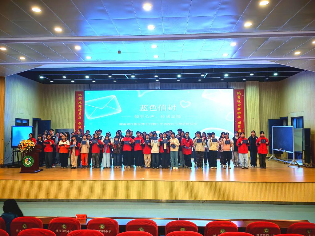 为深入弘扬雷锋精神,落实“健康第一” 教育理念,推进大中小学心理健康教育一体化建设,3月27日,我院“蓝色信封”志愿服务活动在博才白鹤小学温情落幕。学院精心组织65名志愿者走进校园,以一封封承载关怀的蓝色信笺为纽带,在高校与小学之间架起一座传递温暖、倾听心声的心灵沟通桥梁。