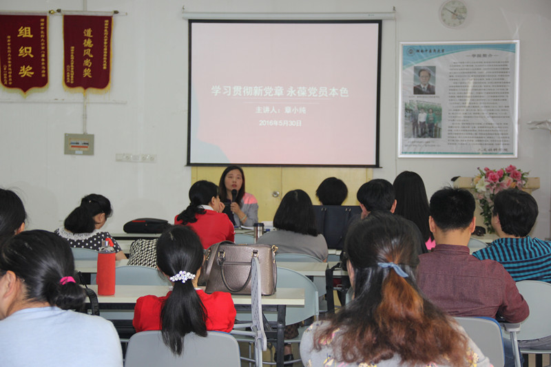会上,党总支成员曹思佳老师还向全体教职员工宣读了《湖南中医药大学人文社科学院关于在全体党员中开展“学党章党规、学系列讲话,做合格党员”学习教育的实施方案》。