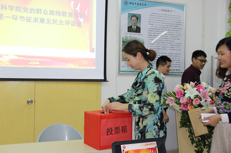 会议第三环节是在学校第五督导组领导的安排之下,组织全体党员教师对人文社科学院领导班子整体进行测评。教师们将认真填写好的测评表,庄严地投放入票箱。会场气氛严肃认真。