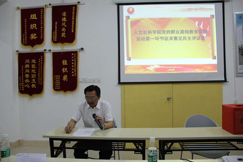 会议第一环节是罗书记就人文社科学院党的群众路线教育实践活动第一环节工作简况作自查报告。在报告中,罗书记对学院在第一阶段深入学习、征求意见环节的各项活动情况作了简单回顾,将活动内容和特点总结为:积极动员,覆盖率达100%;领导带头,认真开展“五个一”学习活动;深刻理解“三严三实”,做群众的贴心人;广开言路,征求意见;边学边改,在全院开展望闻问切凝心聚力谋发展活动。在总结成就之后,罗书记对第一环节存在的问题作了深刻剖析,并就下一阶段群众路线教育实践活动提出了具体要求:一是要提高认识、端正态度,进一步增强搞好群众路线教育实践活动的紧迫感、责任感;而是要改进工作作风,进一步增强教育实践活动的实效性,真正做到边教育、边整改、边提高。罗书记特别指出下一阶段的工作安排重心在于:按时完成学校党的群众路线领导小组安排的任务;组织学院全体党员参观和学习革命先烈的英雄事迹;继续完成学院党的群众路线活动之党员教育系列讲座。