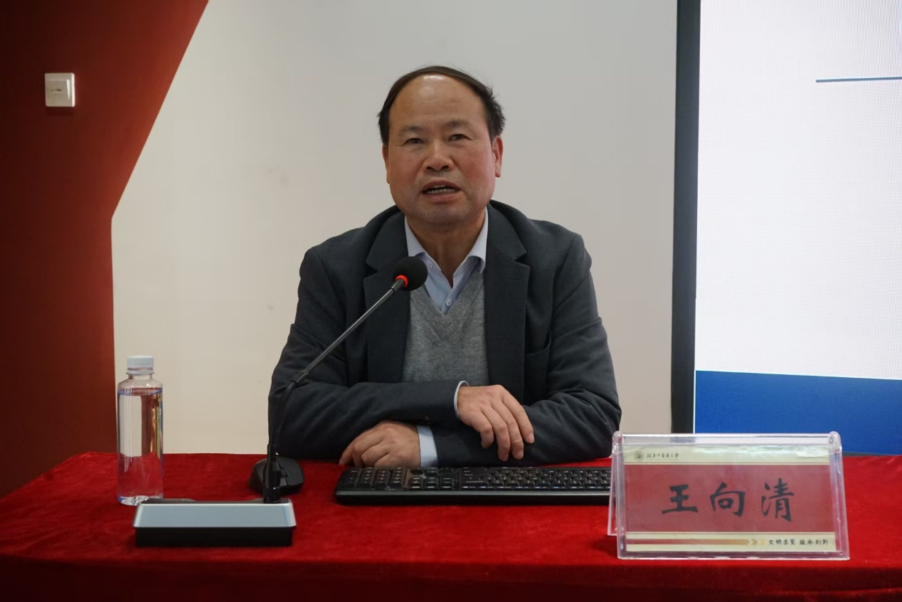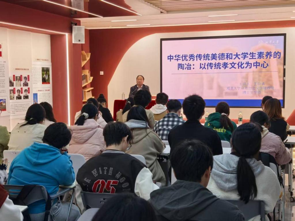 12月11日,学院邀请湘潭大学马克思主义学院教授、博士生导师王向清在湘红书院开展“中华优秀传统文化与大学生素养的陶冶”专题讲座,讲座由学院党委副书记雷秋红主持。